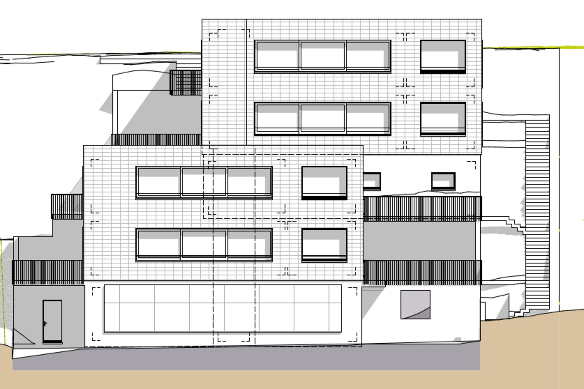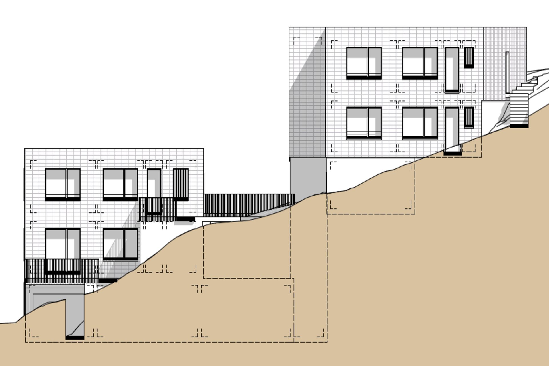 Die Holzbauten auf Betonmauern sind mit witterungsbeständigem Schiefer versehen. Das Kellergeschoss nimmt nur die halbe Haustiefe ein um nicht zu sehr in den Fels einzudringen.