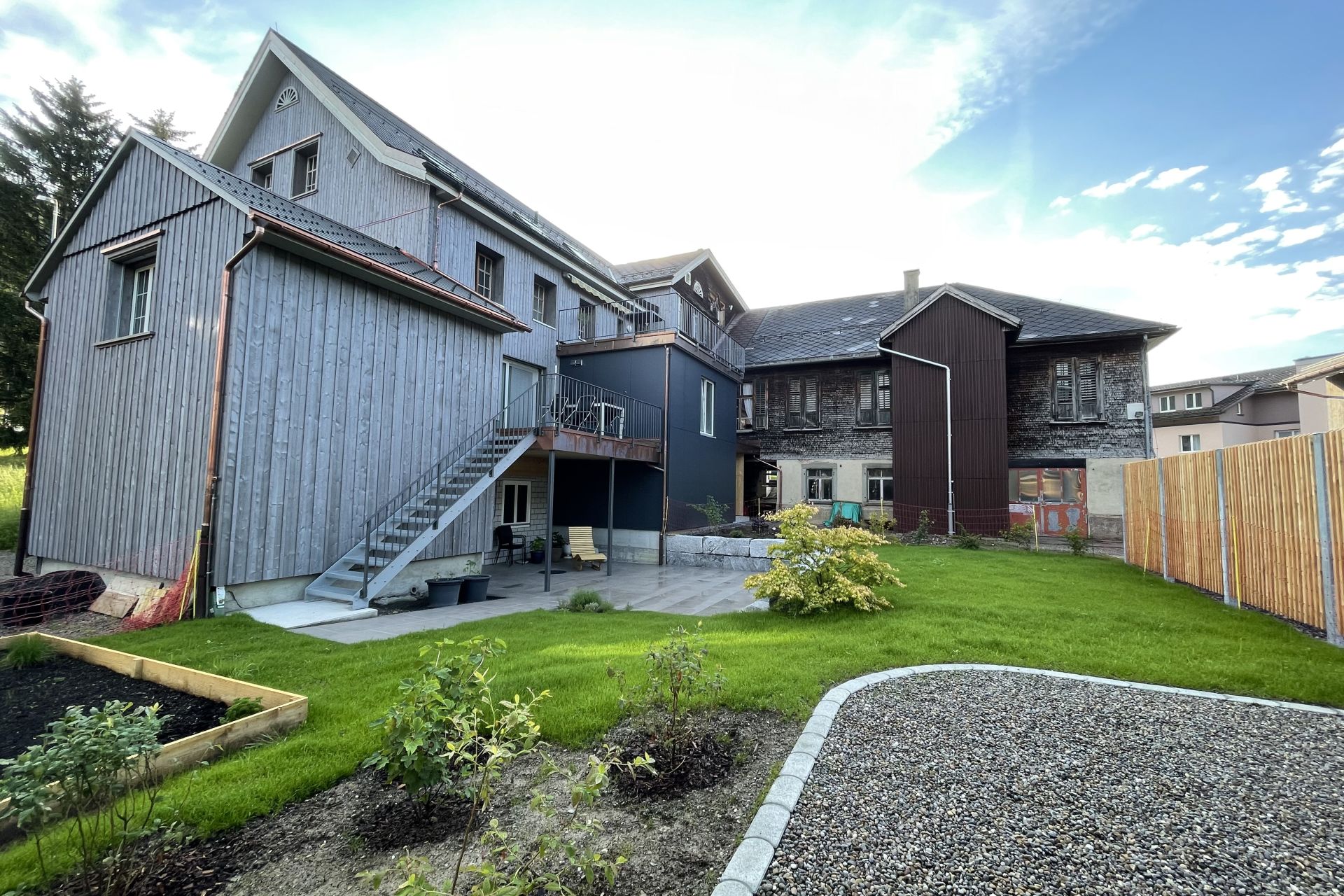 Der grosse und hohe Saal bietet für viel Phantasie Raum, die hohen Fenster helfen bei der guten Belichtung. Die grosse, frei besonnte Terrasse im Erdgeschoss wird auch in Zukunft mit Freude genutzt.