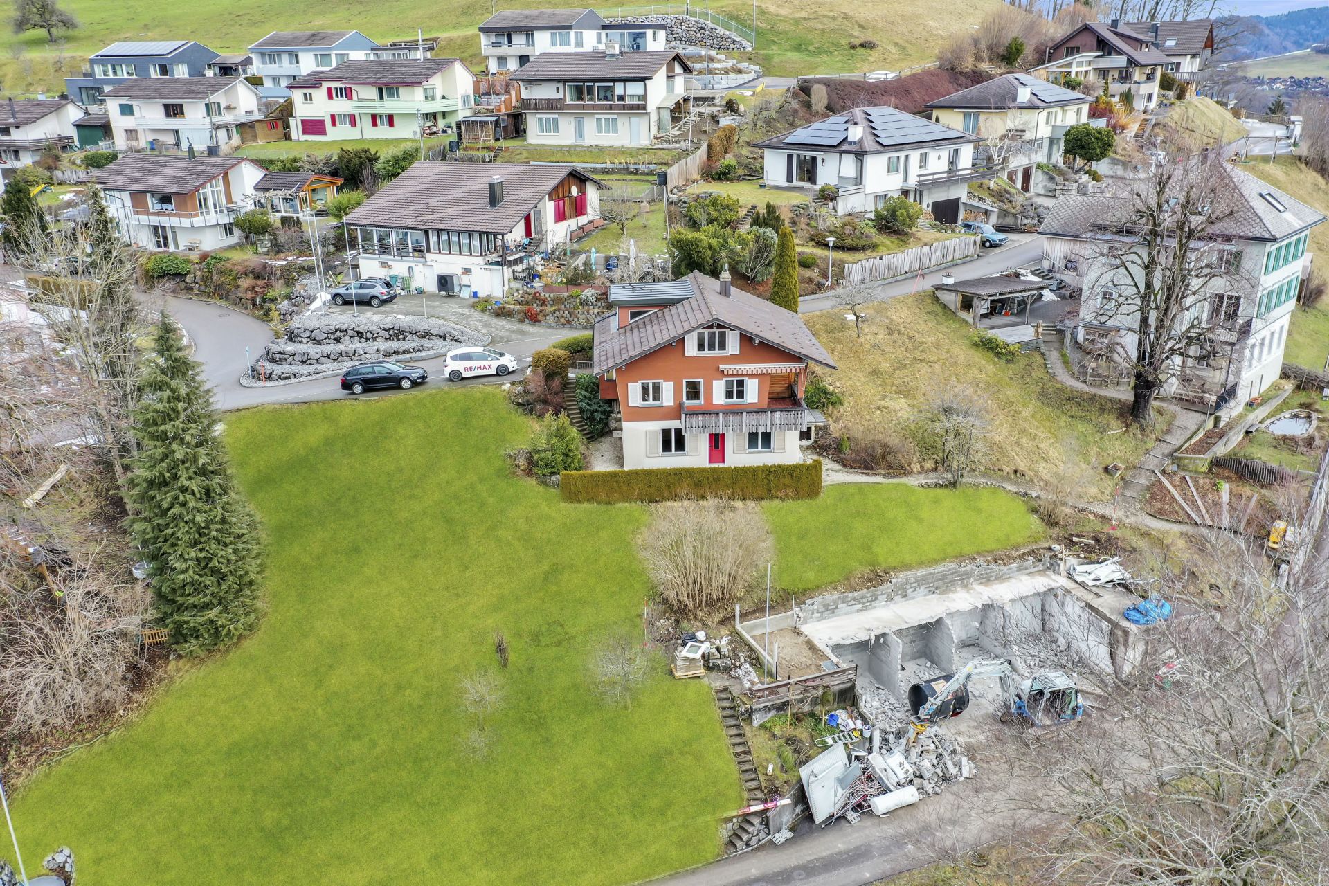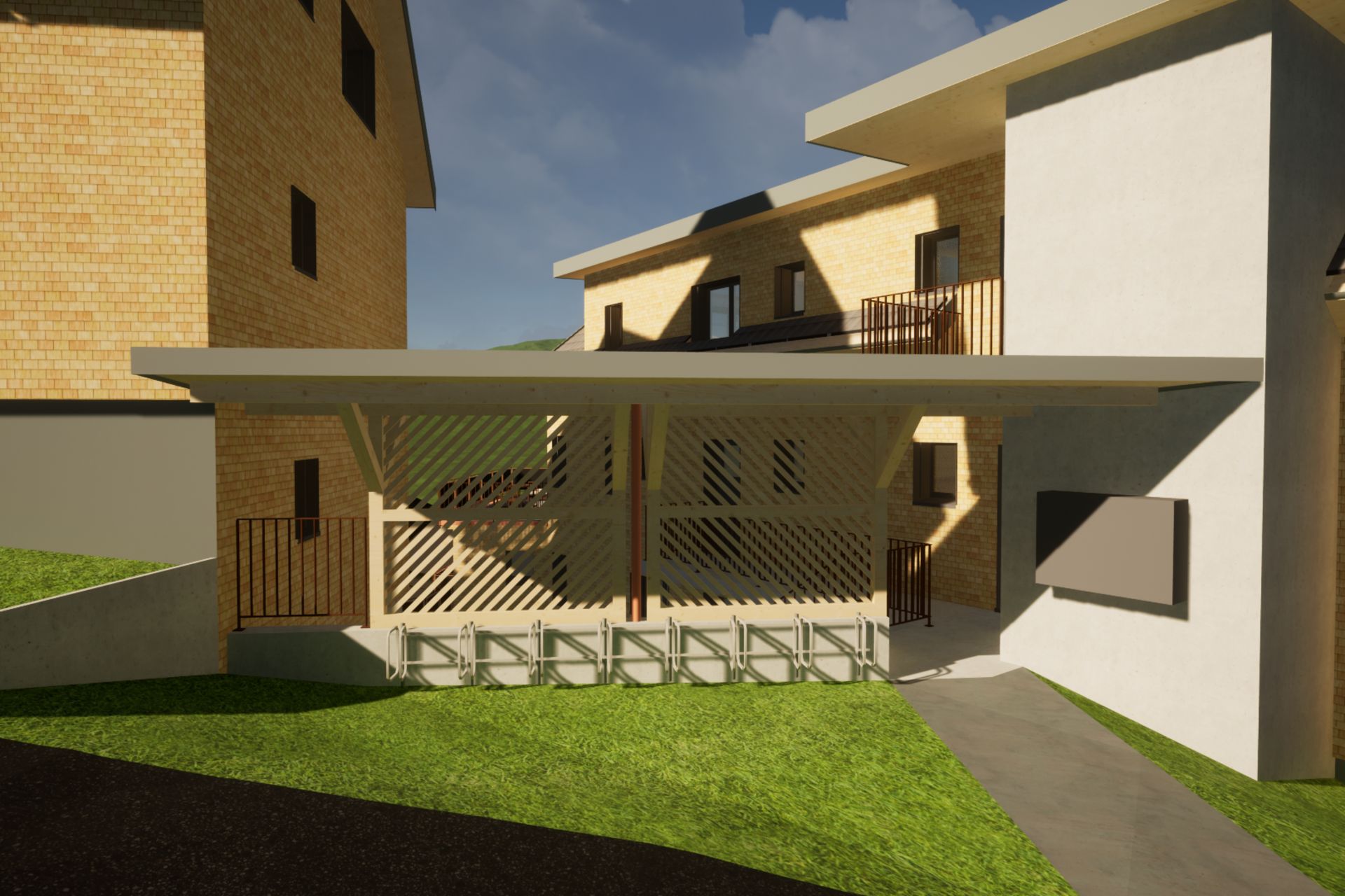Nicht nur, dass alle Gebäudeteile, die aus der Erde ragen in Holzkonstruktion erstellt sind, nein, auch die Holzschindelfassade ist langlebig und aus nachwachsendem Rohstoff. Die Fernheizung aus Holz rundet das Bild ab. Jedes Gebäude verfügt über grosszügige PV-Paneelen auf dem Dach oder als Geländer.