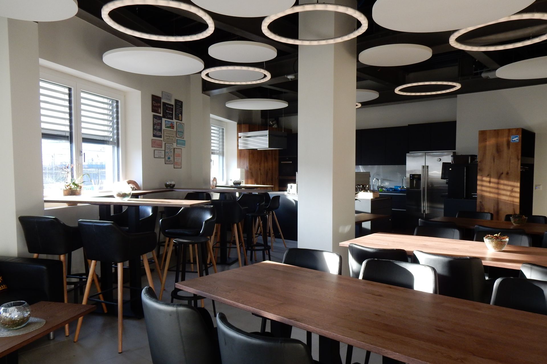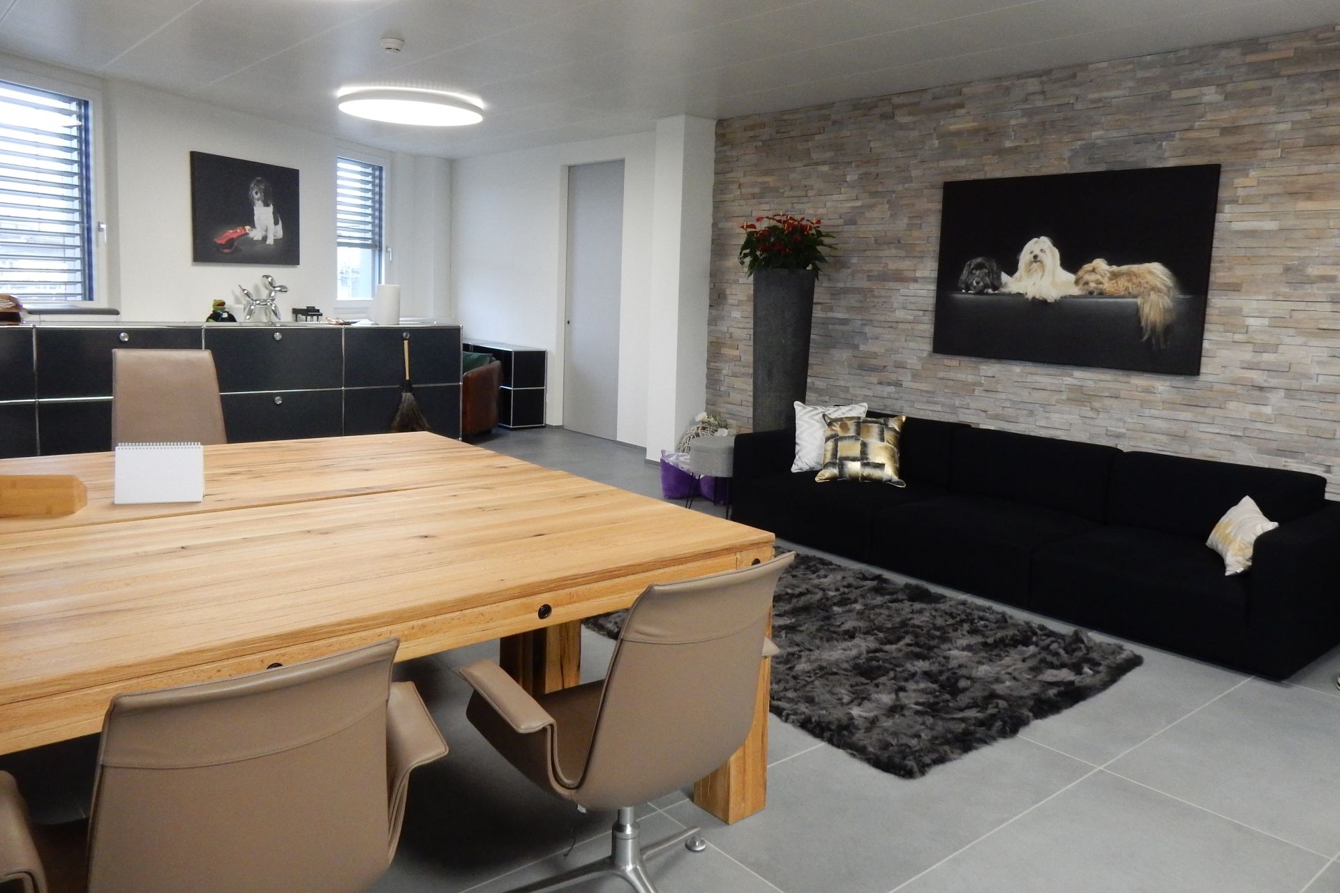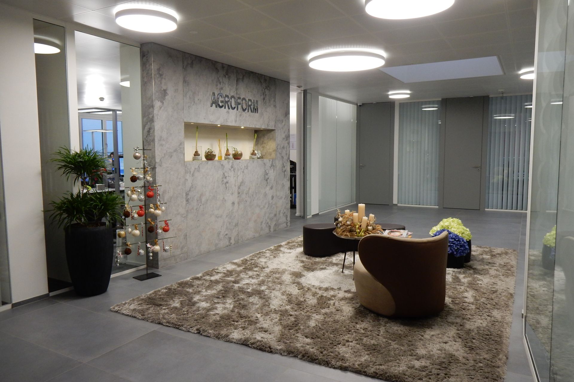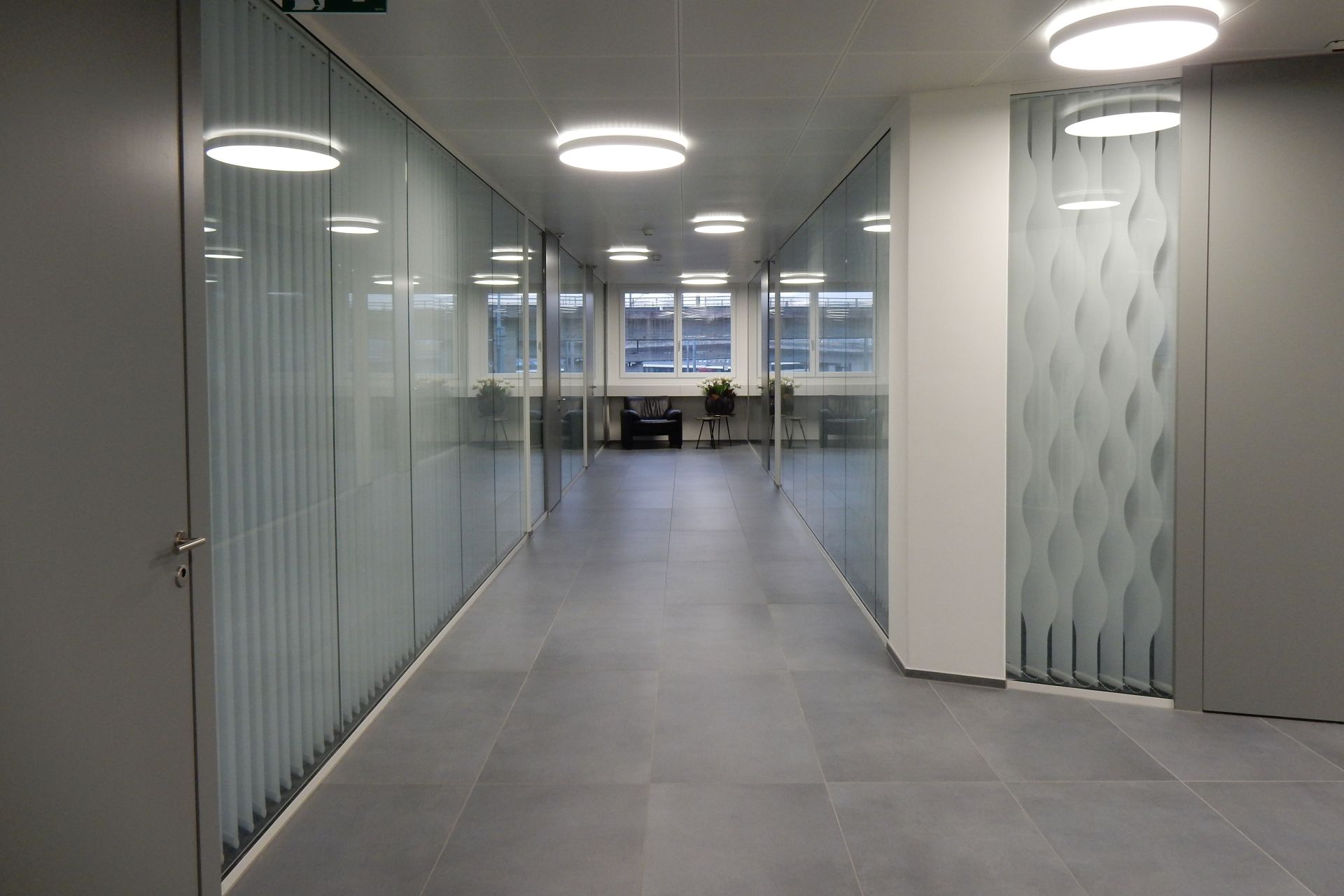 Die Büros sind Korridorseitig hauptsächlich mit Glasscheiben abgetrennt. Die drehbaren Streifenvorhänge ermöglichen dennoch bei Bedarf die erwünschte Privatsphäre. Durch die grosse Grundfläche des Gebäudes, verfügen auch die fensterlosen Räume dank der grosszügigen Dachfenster über ausserordentlich angenehmes Tageslicht.