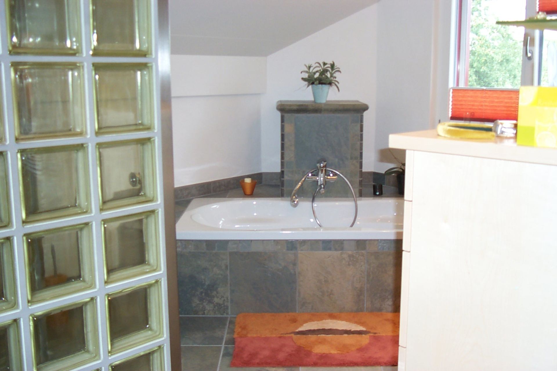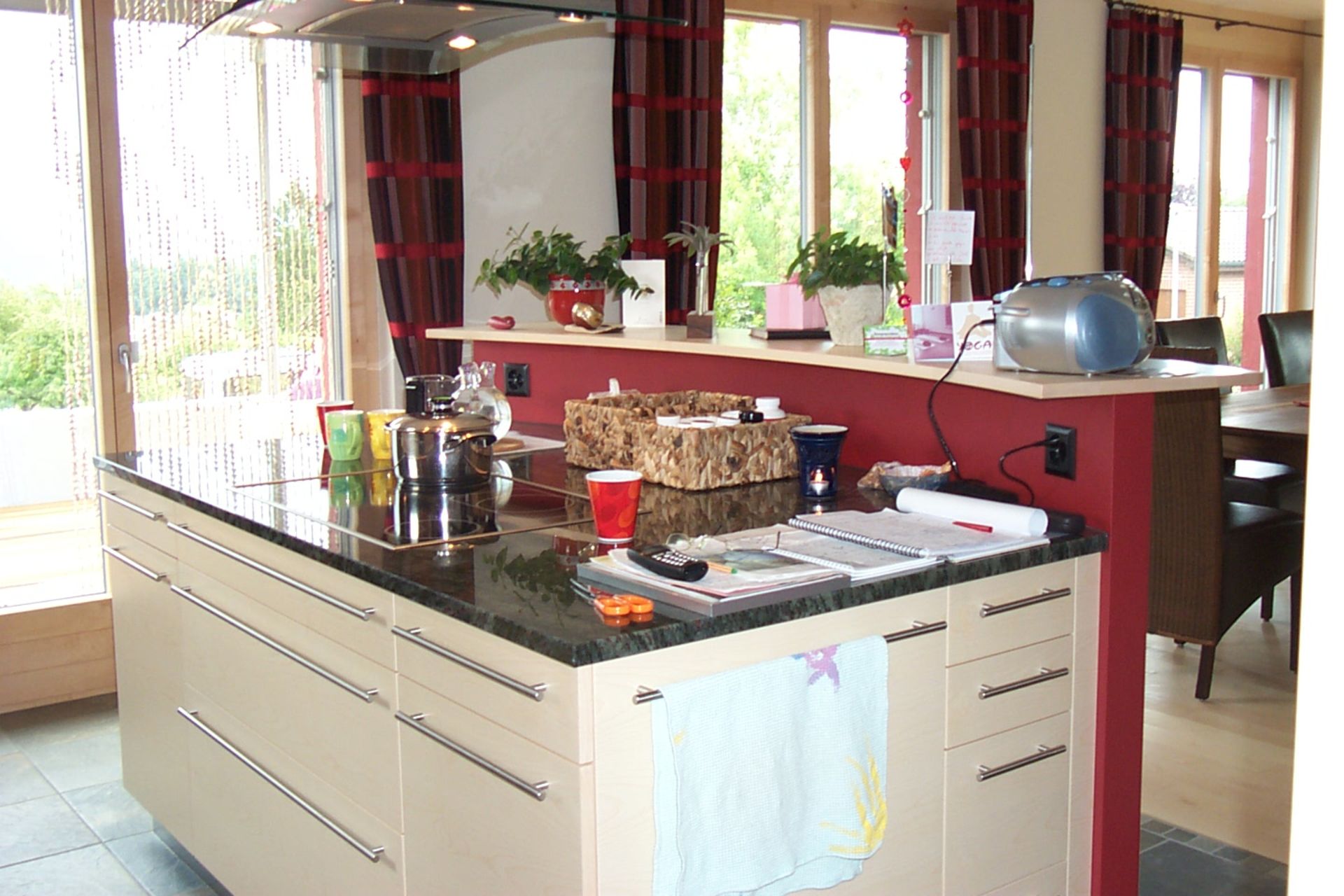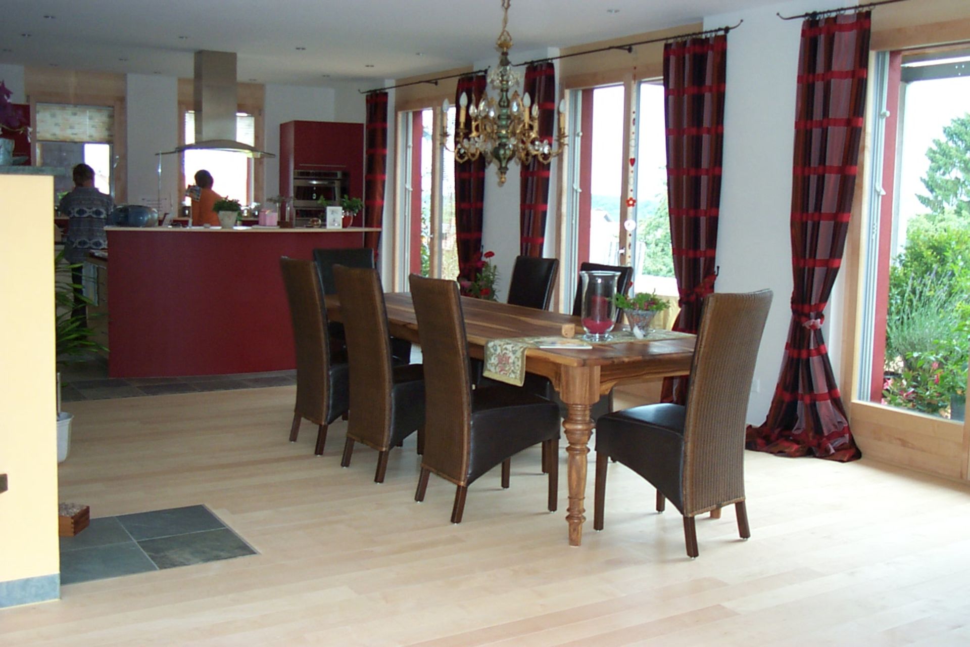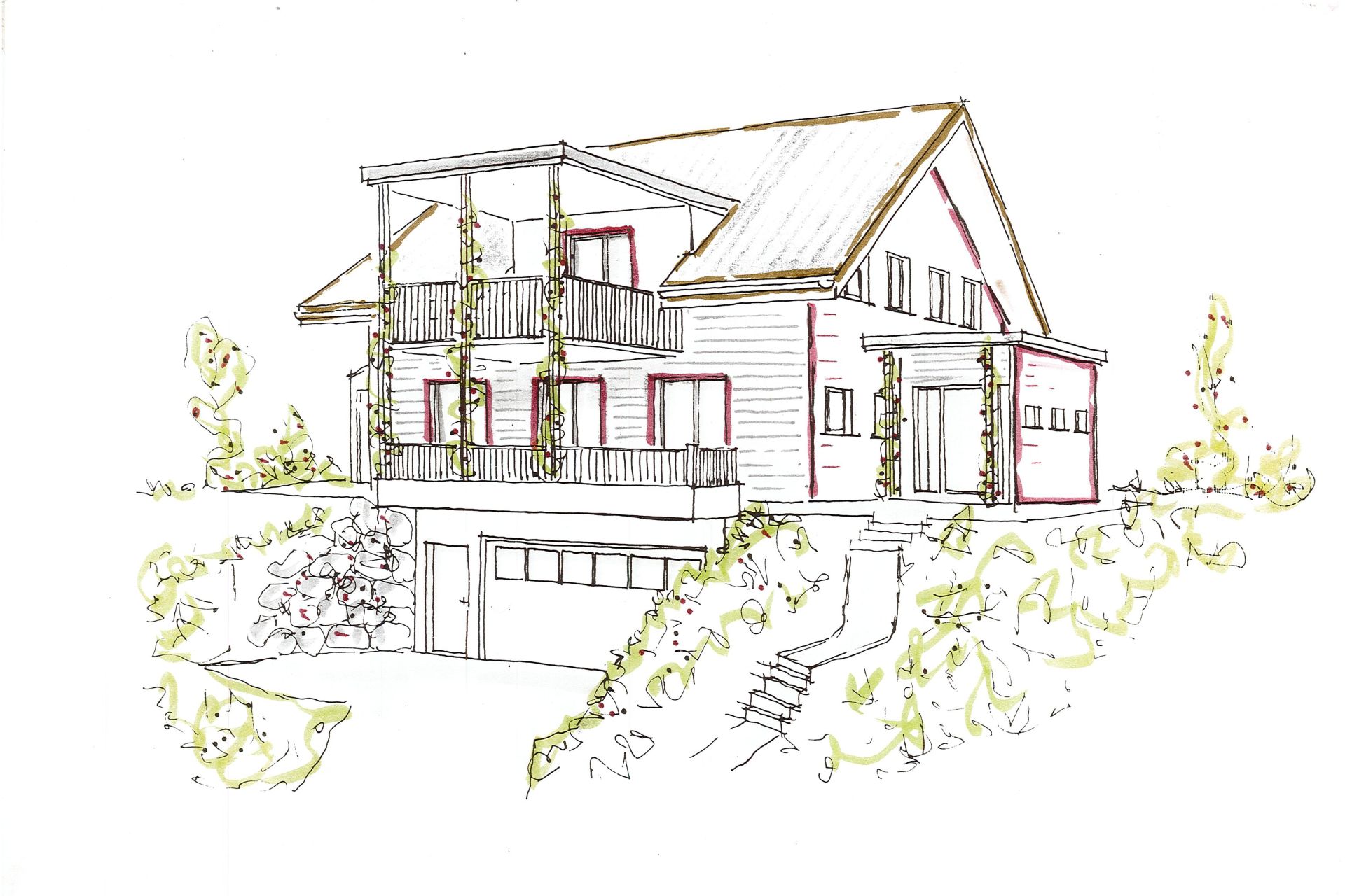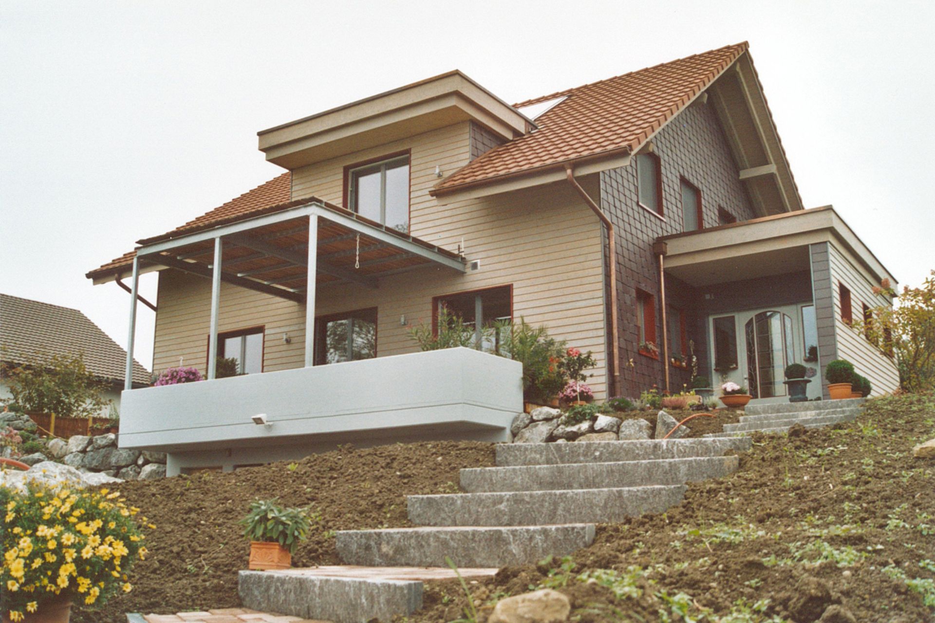 Das Zweischalenmauerwerk ist ein wunderbarer Wärmespeicher und reduziert den Bedarf an Heizungsenergie wesentlich. Die Westfassaden sind mit weinrotem Naturschiefer verkleidet und spielen sehr schön zusammen mit der Holzfassade auf der Nordseite. Der Regenwassertank im Erdreich versorgt in den trockenen Jahreszeiten den grosszügigen Blumengarten mit Wasser.