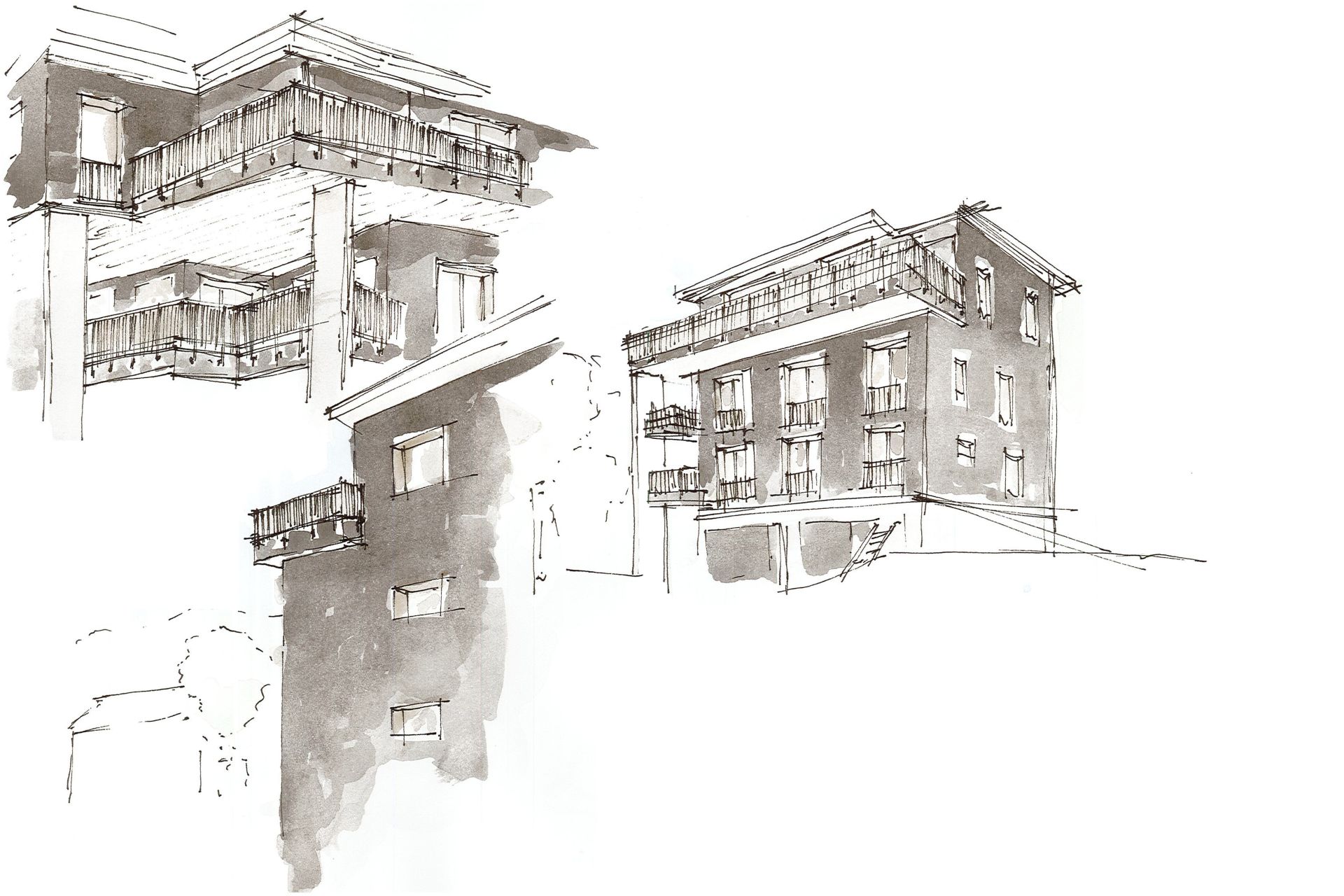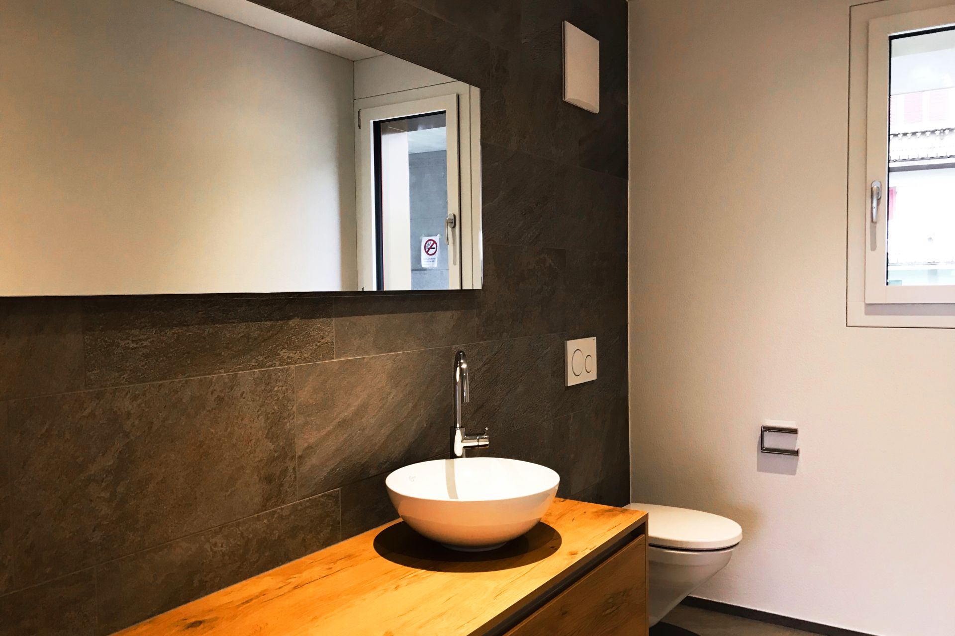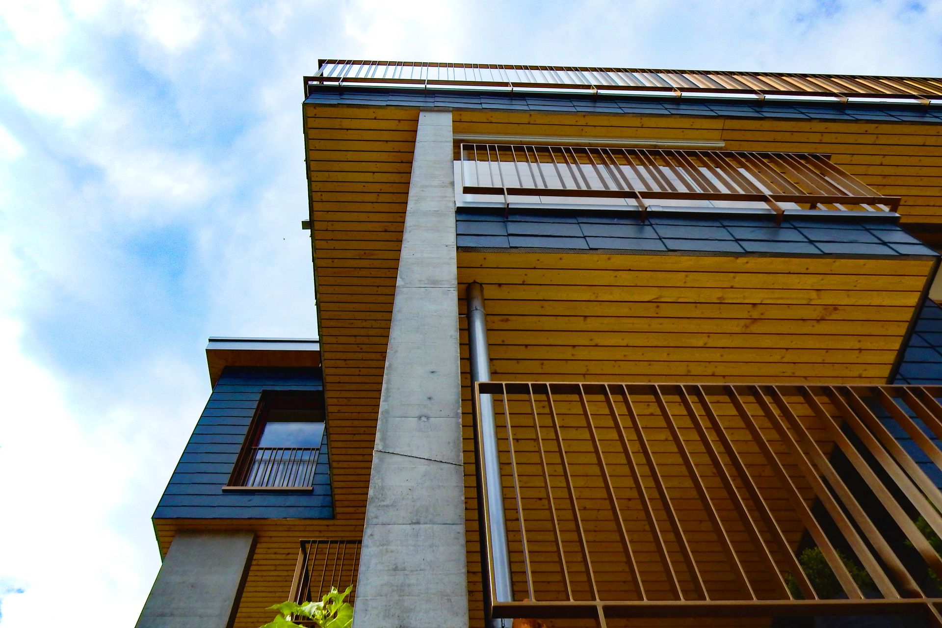 Der 3 geschossige Holzbau mit Holzfaserdämmung und Schieferfassade ist mit Sichtbetonelementen ergänzt. Die Bewohner werden, solange sie darin wohnen bestimmt nichts an der Fassade zu sanieren haben. Die Erdsondenheizung ist durch ein freecooling ergänzt und lässt im Sommer durch die Bodenheizungsrohre Kühle in die Räume strömen.