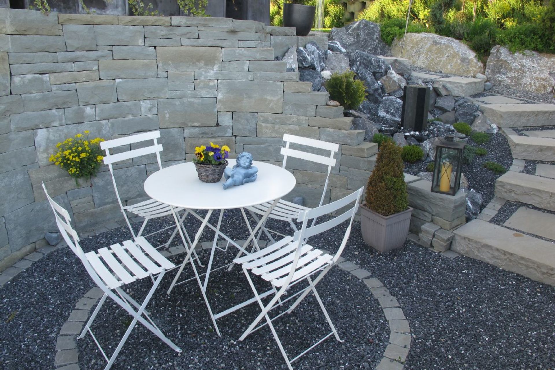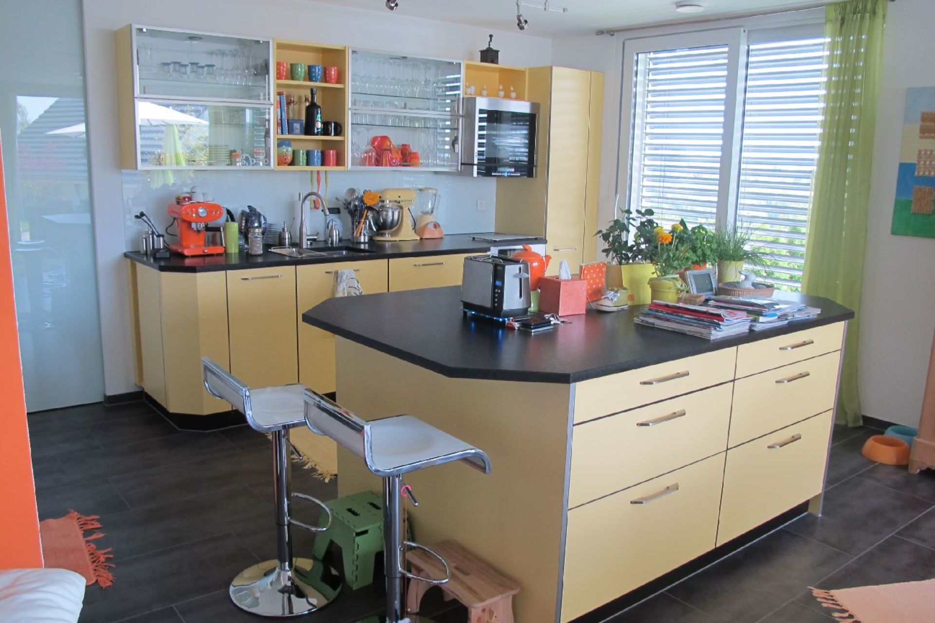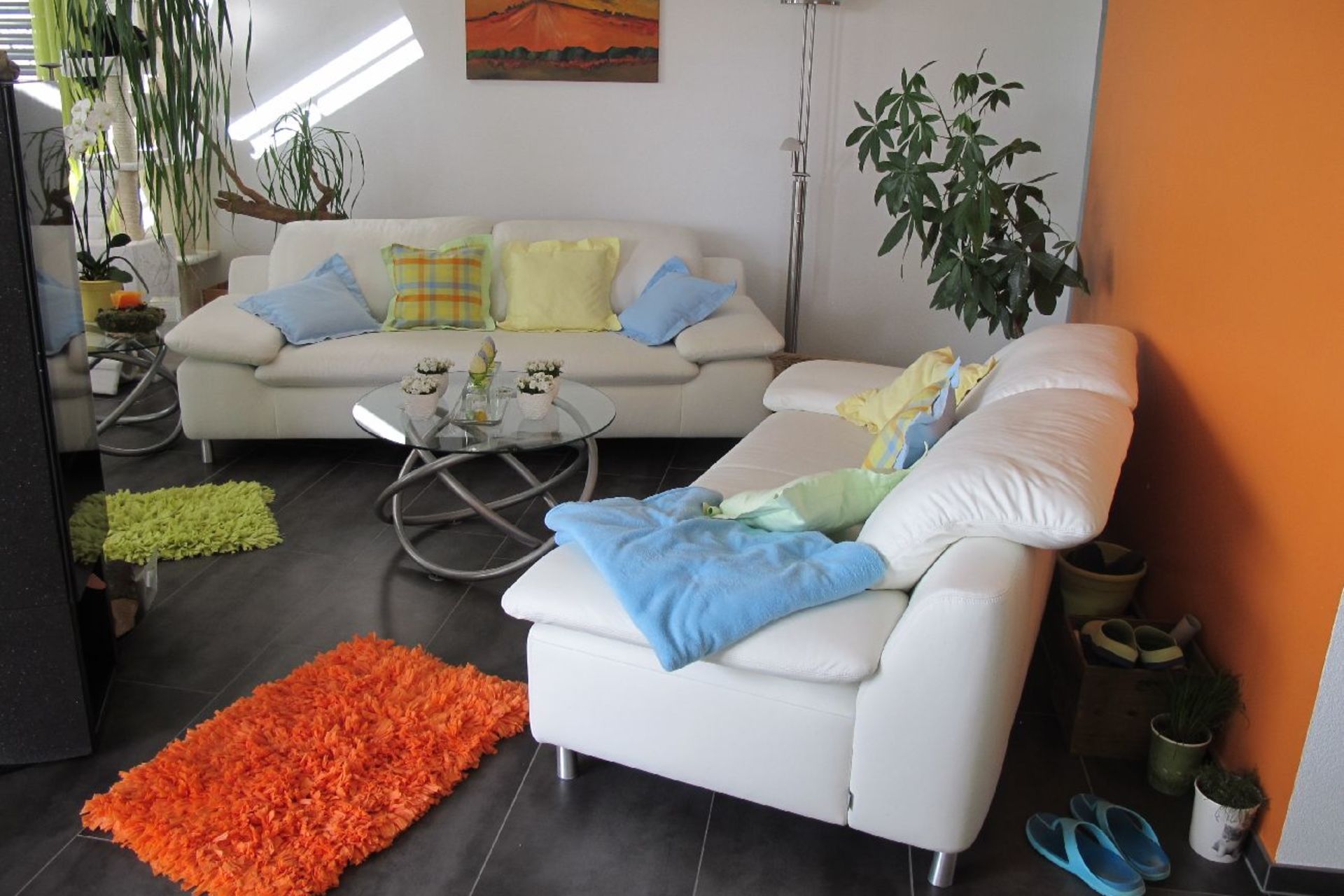 Der offene Dachraum mit der Galerie lässt den Blick ins Wohnzimmer grosszügig zu. Die Bewohner sind so untereinander verbunden ohne direkt im gleichen Raum zu sein. Verschiedene Farben und Materialien lassen die Räume ausserordentlich erscheinen. Der mit viel Liebe gestaltete Garten.