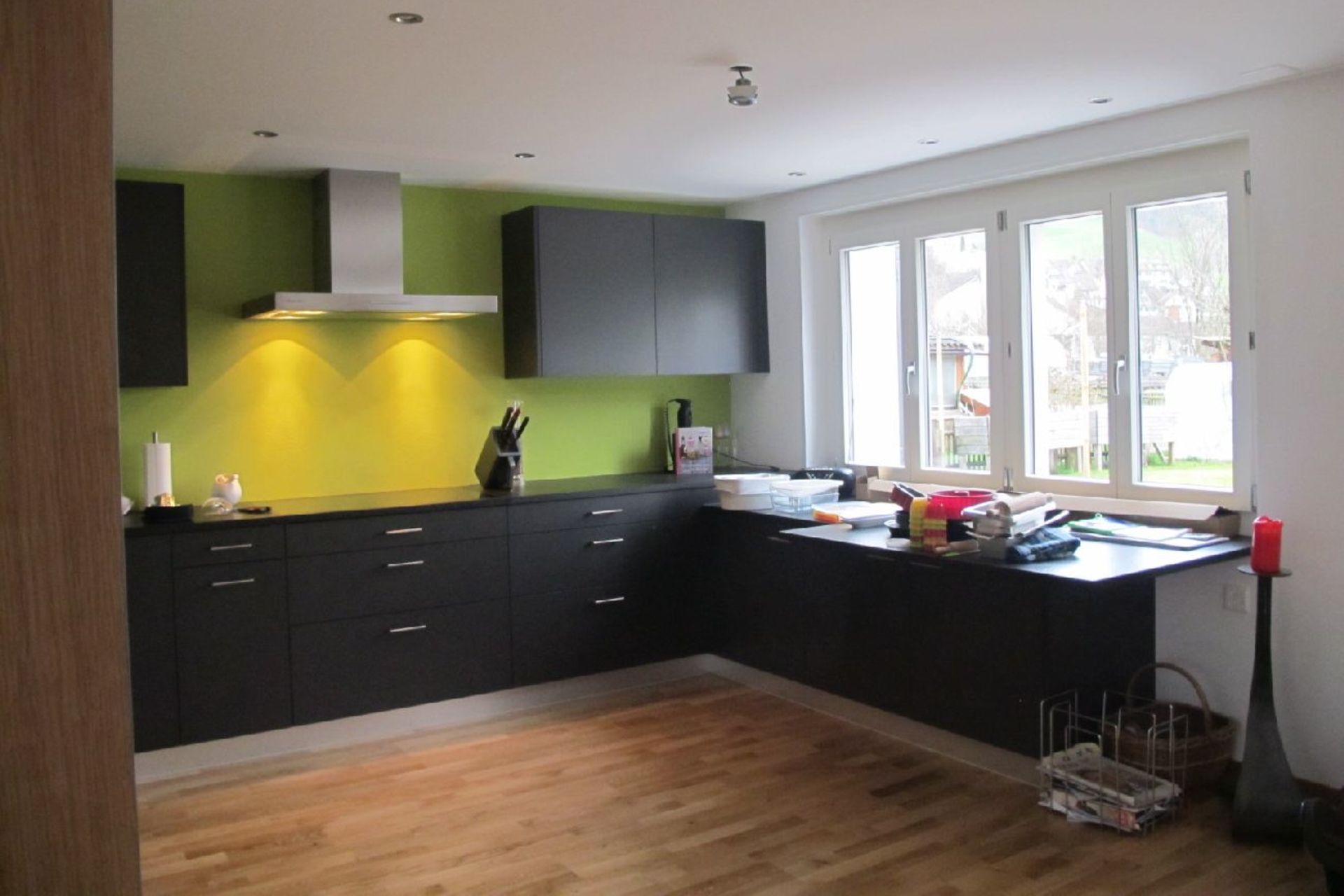 Die neu angeordnete Küche liegt perfekt mit Sicht zum grossen Garten. Der nun gedeckte, mit Bruchgranit belegte Sitzplatz ist wenige Stufen vom Garten entfernt. Eine kleine Brücke verbindet den Sitzplatz mit dem Vorplatz zum Kinderspielzimmer. Die über zwei Geschosse gestaltete Wohnung verfügt über ungewöhnliche und grosszügige Räume.
