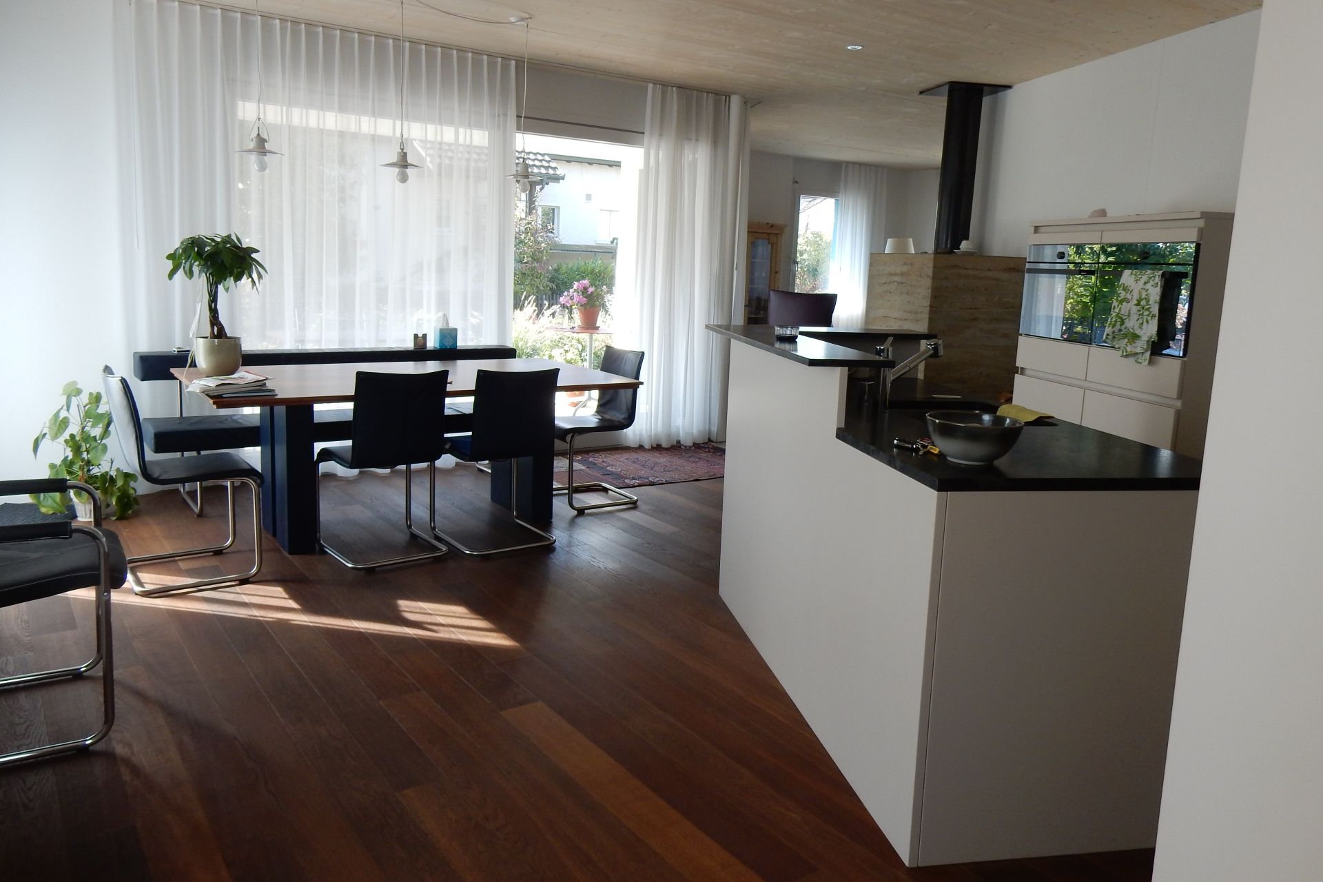 Das Raumkonzept wird vielen Bedürfnissen und möglichen Lebenslagen gerecht. Nebst dem 5 ½ Zimmer Hauptteil, steht eine 2 ½ Zimmer Wohnung und ein B&B Zimmer mit Dusche und eigenem Zugang zur Verfügung. Die innen liegenden Korridore im Obergeschoss sind durch die gewölbten Dachfenster mit Tageslicht durchflutet. Die etwas eigenwillige Schräge Eingangstüre entstand durch die Berechnung der optimalen Lage nach Feng Shui und definierte auch die schrägen Wände im Innenbereich, welche aussergewöhnliche Formen der Räume hervorbrachte; immer auf die Bewohner abgestimmt.