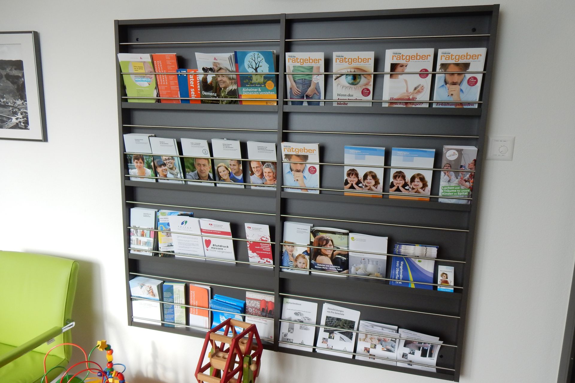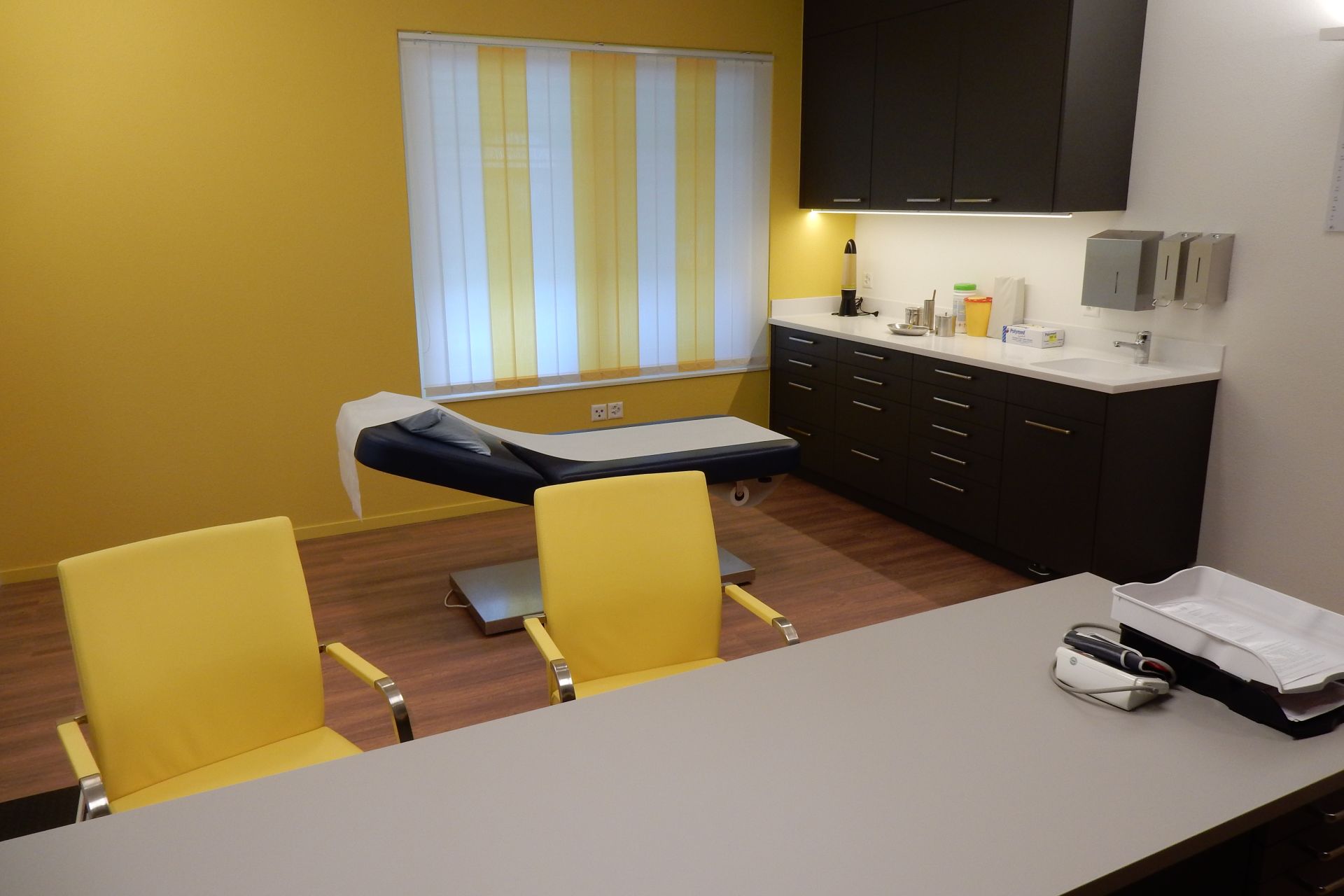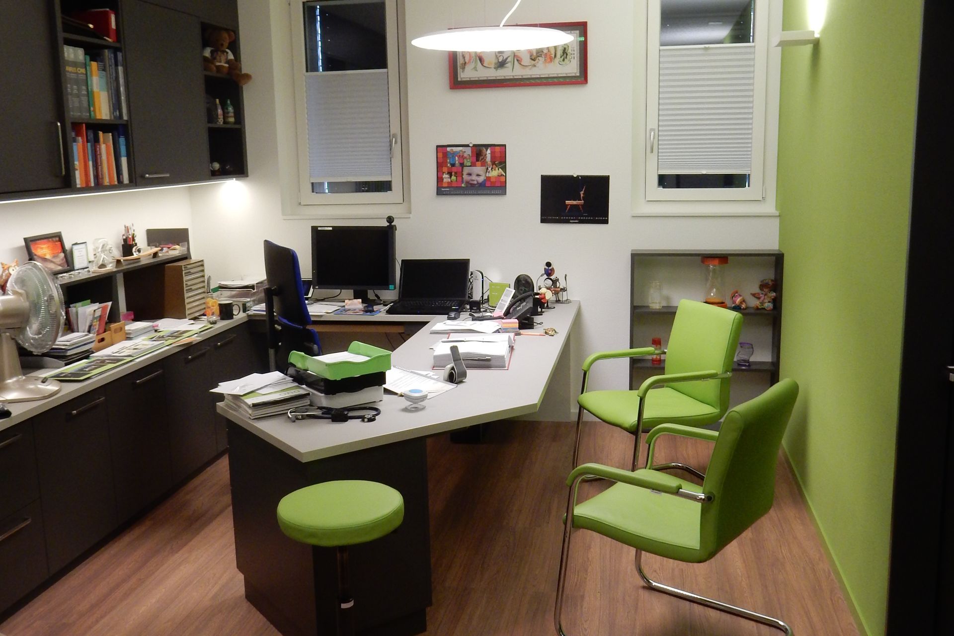 Der grosszügige Eingangsbereich lässt die Besucher vergessen, dass sie eine Arztpraxis betreten. Frische Farben, ausgeklügelte Beleuchtung und einen Naturstamm als Garderobe helfen dabei. Rot, Orange und Grün dominieren im Warteraum. Die mit Schlitzholz belegte Bogenwand führt zu den Praxisräumen.