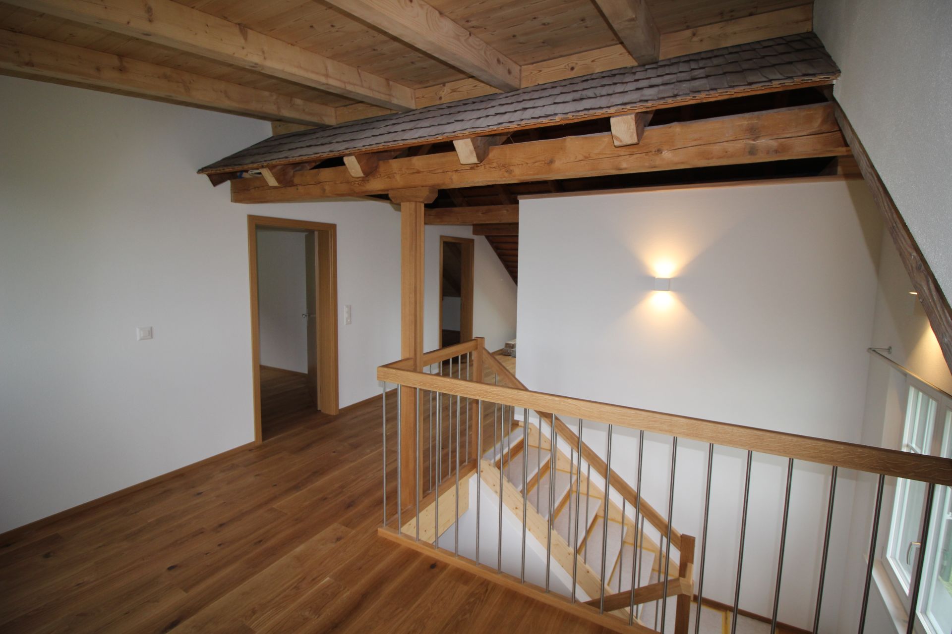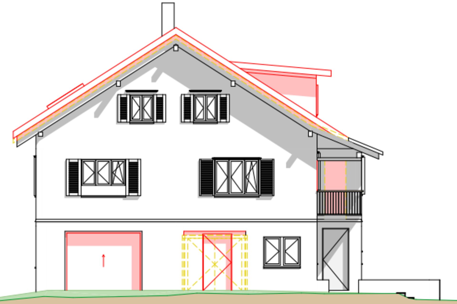 Das grosse Dachgeschoss soll neu auch genutzt werden und erfährt eine umfangreiche Nachdämmung. Die Elektrospeicheröfen werden durch eine Luftwasserwärmepumpe ersetzt. Die Decke über Werkstatt und Garage werden nachgedämmt und ein Windfang im Korridor vermeidet Durchzug in die oberen Stockwerke.
