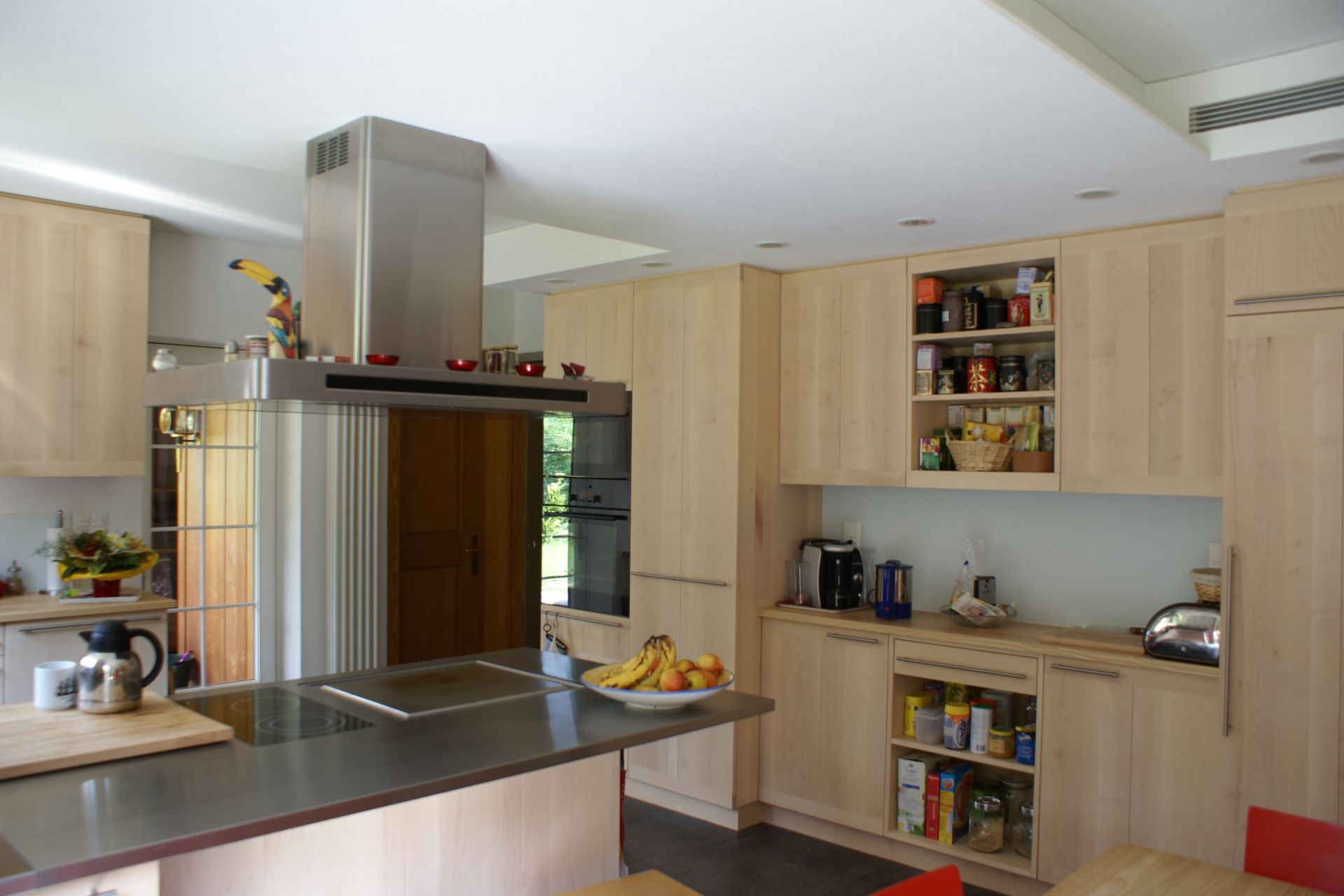 Die Küche ist durch die Vergrösserung zum eigentlichen Begegnungsraum mutiert. Die flexible Verglasung beim gedeckten Sitzplatz, lässt diesen um ein Mehrfaches nutzbar machen.