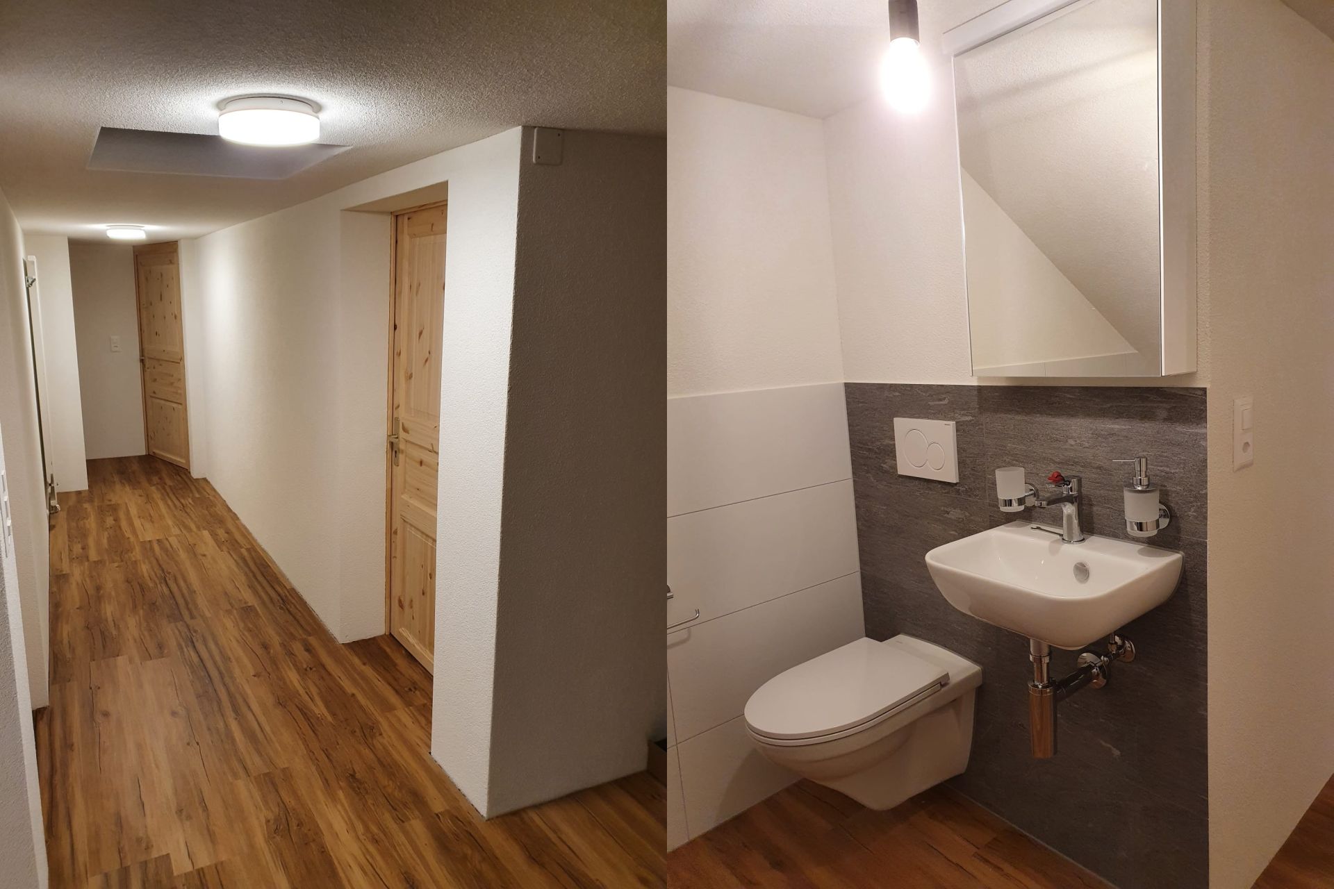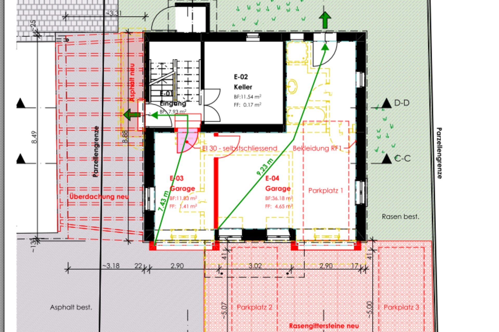 Als Ergänzung zum bestehenden Wohnhaus nebenan, werden im Umbauprojekt grosszügige Garagen eingebaut. So kann die Bauherrschaft an ihren Autos herumschrauben und den Beruf oder das Hobby voll auskosten. Die oberen beiden Geschosse werden als Mietwohnung genutzt.